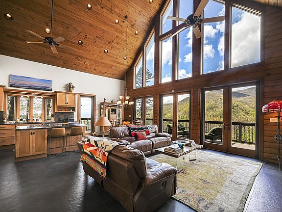 Gather with loved ones in the heart of the home, where soaring vaulted ceilings, floor-to-ceiling windows, and three large glass doors frame breathtaking mountain views in every direction. These doors open directly onto the main deck, creating a seamless indoor-outdoor experience perfect for morning coffee or an evening glass of wine.