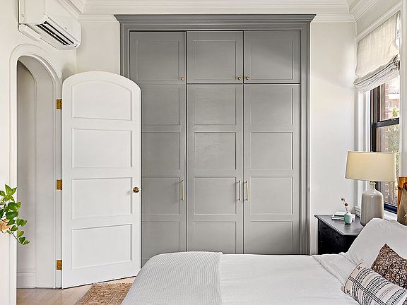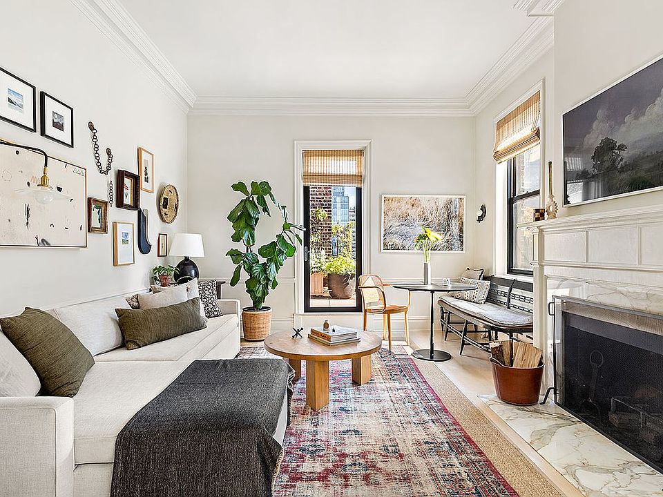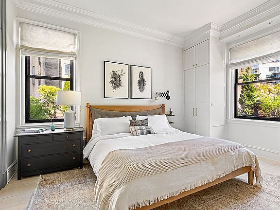 In the corner bedroom, you wake to greenery and sky. There’s a quiet nook for work or daydreaming, and closets—many of them—built to hold more than just your wardrobe. The bath is clad in Carrera marble, with a soaking tub that invites you to linger. Ten-foot ceilings, white oak floors, mini-splits, and a truly spectacular private terrace complete the picture.