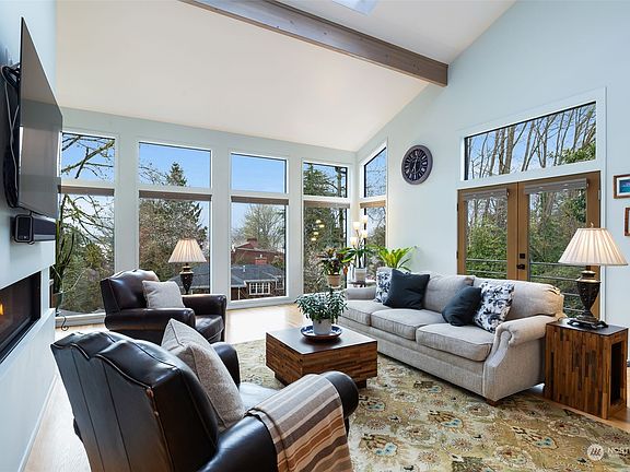 Elegant and sophisticated custom built contemporary nestled into a classic PNW setting with views of Lake WA, the snow-capped Cascades & lovely sunrises. Floor-to-ceilings windows and French doors to the deck perfectly frame the views and tranquility of the serene setting. A light-filled open layout for modern living; the chef’s kitchen flows to dining, family room & stunning living room with vaulted ceilings & cozy fireplace. Upstairs the primary bedroom & library feature built-in bookcases, fireplace, deck, soaking tub & walk-in shower. Lower level has 3 bedrooms and guest bath. Recent updates include A/C, EV charger, on-demand H2O, furnace. Driveway + 2 car garage. Steps to Leschi Village for eats, drinks, coffee, groceries & beachfront.
