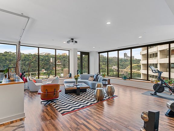 The open floor plan features expansive walls of windows with built-in seating, offering breathtaking panoramic views of the river and city. Enjoy spectacular sunrises and sunsets daily from this one-of-a-kind customized condo. Begin your mornings with the fog rising from Mt. Washington and conclude your evenings with sunsets casting a warm glow on the city's architectural skyline. The inviting great room creates the perfect ambience for entertaining, with an impressive backdrop of Mt. Washington, the Monongahela River, and iconic bridges.