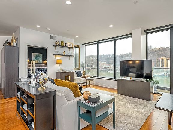 Be mesmerized by the twilight skyscape of Mt Washington, Station Square and the river from this spacious condo in the prestigious 151 First Side. The completely updated kitchen has a neutral quartz countertop, a large stainless steel sink, electric stove, microwave and refrigerator...all new! The open floor plan allows for river views from every room. The posh owner's suite features large closets, tub & shower, double bowl sink, updated accessories & floor to ceiling window with a view! The additional bedroom/flex space with full bathroom is freshly painted and updated. Enjoy your own utility room with washer & dryer, shelving, and laundry tub. New extra large water heater! Bonus feature - This unit has a balcony! Secure building w doorman, parking garage w 1 assigned spot, gym, courtyard and lovely lobby. Small storage unit available in building. Conveniently located near The Point, Market Square, Station Square, and sports venues. Low monthly HOA! Location location location!