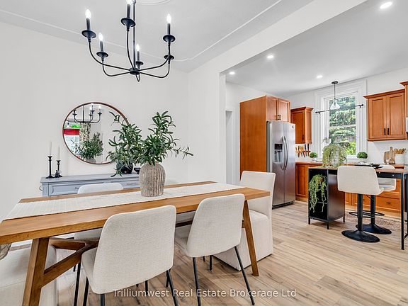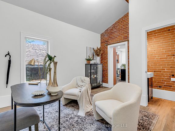 Beautifully restored century home, combining timeless character with modern updatesperfectly situated in the quaint and welcoming town of Arthur. Set on a mature, tree-lined lot, this red brick beauty offers exceptional curb appeal with a circular driveway, steel roof, an enclosed front porch, and a side entrance with a covered porch. Inside through the side entrance you are welcomed into a stunning multi-purpose space with vaulted ceilings, wood beam, new vinyl flooring, and a newly added 2-piece bathroom. This versatile area makes for an ideal family room, playroom, or a private home office with its own separate entrance and bath. The vinyl plank flooring continues throughout the main floor, leading you into the heart of the home. Here, you'll find stainless appliances, 9ft ceilings, tall baseboards, potlights, and abundant cabinetryincluding a charming built-in bench beneath the window. Off kitchen, the living and dining room are rich in character with stained glass accents, intricate ceiling details and an elegant dining chandelier, ideal for hosting guests. The second level boasts original hardwood flooring and brand-new interior doors and trim. Three generously sized bedrooms, including a nursery with a modern board-and-batten accent wall. The primary bedroom features exclusive access to the loft currently used as a dream walk-in closet and dressing room, but easily adaptable as a personal retreat, home office, or den. The beautifully renovated main bathroom features sophisticated slate-grey tile, in floor heating, a double vanity with quartz countertops and stylish wallpaper and board-and-batten accents. Outside, the large, private yard offers ample space for outdoor enjoyment, framed by mature trees. This ideal location is just a short walk to downtown, parks, schools, the public pool and splash pad, as well as the Arthur Arena and Rec Centre. This is a rare opportunity to own a home that effortlessly blends historic charm with contemporary comfort.