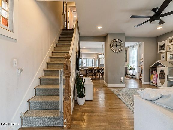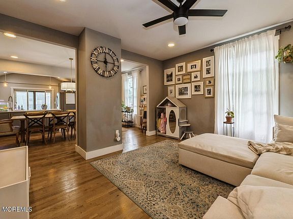 This beautifully renovated home features an open floor plan with natural light, hardwood floors, and a modern kitchen with quartz countertops, ample storage, and stylish finishes. The adjacent dining room adds extra elegance.