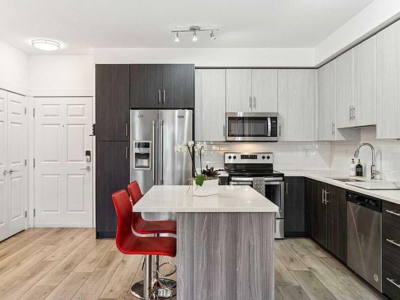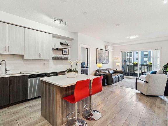 **JUST PRICE REDUCED** Don't miss this beautifully appointed 2-bedroom, 2-bathroom condo—your perfect retreat in sought-after Legacy! Offering a spacious 864 sq ft of modern living, this thoughtfully designed home features an open-concept floor plan. Enjoy the bright west-facing sun from your balcony—perfect for evening sunsets and quiet moments. The kitchen is a true highlight with sleek quartz countertops, stainless steel appliances, a functional island, and space for a dining table. A stylish modern color palette, wide plank vinyl flooring, and air conditioning add to the upscale comfort throughout. The two bedrooms are ideally situated on opposite sides of the unit for maximum privacy—each paired with its own full 4-piece bathroom, including a primary ensuite with dual vanities & updated shower fixtures. Additional perks include a titled underground heated parking stall, storage locker, and rented stall if you so desire. Located down from All Saints High School, & plans are underway for a K-9 school. Legacy boasts amenities to cater to everday needs and lifestyle preferences. Legacy Village & Legacy Corner shopping districts offer a range of retail stores and restaurants. Fitness 1440 & F45 Training Academy are conveniently located. There are 15 km of interconneted walking trails, 10 parks, 3 ponds, and 4 soccer fields. Quick accesss to Macleod Trail, Stoney Trail & public transit options! Simply move in!