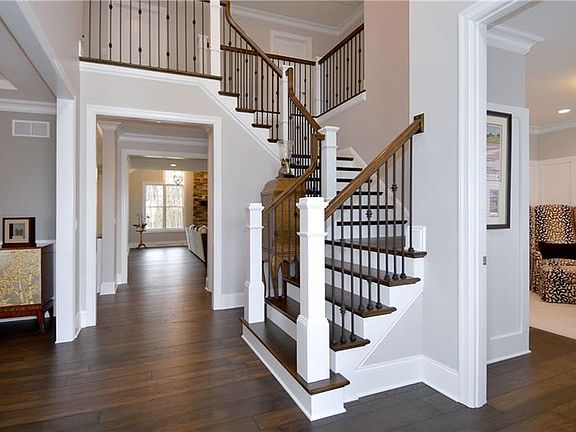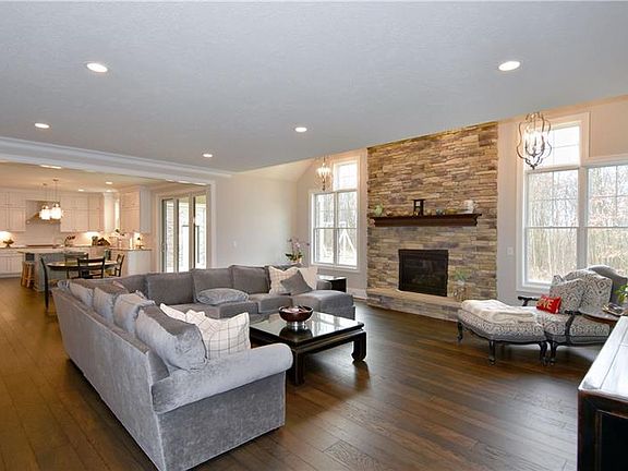 CUSTOM BUILT HOME in Carriage Manor...Extra spacious room sizes receive lots of natural sunlight throughout this open floor plan. Unique main level features center stationed entertaining area w/wet bar & elegant stone detailed wine storage display, 2 story stone fireplace with raised stone hearth in great room, 2 story open foyer is enhanced by a turned staircase, extra wide plank hardwood floors on entire 1st floor of this transitional style home. Each & every bedroom has an attached full bathroom. Covered front & rear porches w/wood ceilings & accent timbers invite you to enjoy the surrounding scenic views. Abundance of amenities...top of the line appliances, beautiful lighting fixtures, huge HIDDEN kitchen pantry, interior/exterior audio and scenic lot provides privacy for outdoor entertaining and possible future pool. Good size rear yard backs to mature trees & dedicated green space. Finished basement w/additional full 5th bathroom. 4 car oversized/attached garage