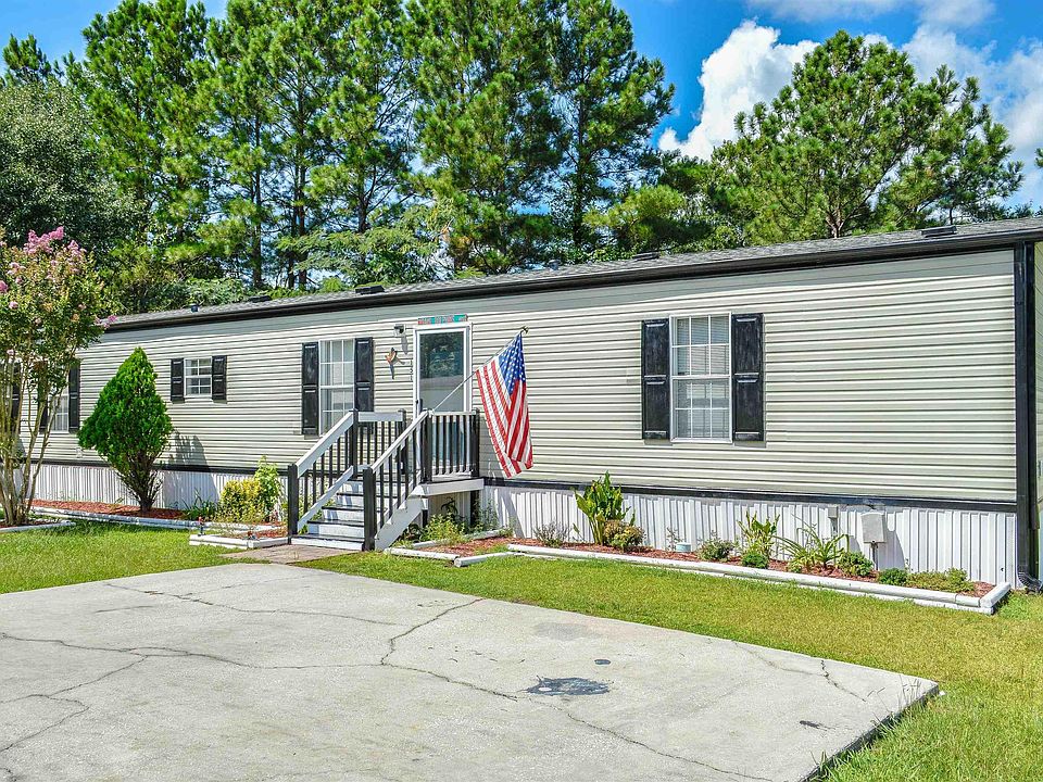 PRIME 3 bedroom 2 bathroom singlewide manufactured home for sale in the popular secluded community of Bellamy Place. Conveniently located just off highway 701 in the Socastee area of Myrtle Beach - close to lots of shopping, dining, and a short drive to Market Commons, Airport, and beach! Home has been very well maintained by current owners and has a NEW ROOF as of July 2022. Sitting on a spacious lot with plenty of yard space - the home backs up to woods and features a large detached storage shed, small front porch and large wood back deck/porch. Walking through the front door you enter into a foyer with large living room featuring an overhead ceiling and carpet flooring. Open spacious floorplan garners lots of natural light and illuminates the living area. Huge upgraded kitchen is equipped with plenty of cabinet space, pendent lights, a full set of black appliances, island with stacked stone, dining area, pantry, laminate flooring and door access to the laundry/utility room with full size washer/dryer and overhead storage. Split bedroom floorplan with the master suite on the left and the other two bedrooms and full bathroom on the right. Master features an overhead ceiling fan, carpet flooring and bathroom en-suite with oversized garden tub, walk-in shower, double sink bowl vanity, and large walk-in closet. The other two bedrooms feature overhead ceiling fans, carpet flooring, and plenty of closet space. 2nd full bathroom has a single bowl vanity, laminate flooring, and tub/shower combo. This home is in excellent condition and priced to sell - you won't find anything else in this price range with the condition and features this home offers. Schedule your private showing today before this one is sold!