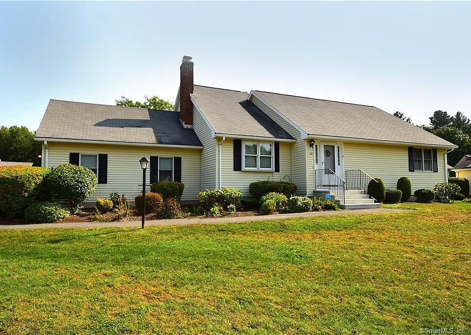 Rarely available immaculate stand alone ranch with attached 2 car garage! An excellent value for those considering a pricier over 55 home! Special features include fabulous open floor plan combining living room, dining room and kitchen with cathedral ceiling, floor to ceiling fireplace and ceiling fan. French doors open onto the light and airy 4 season sun room for large crowds, or close off if you need some quiet away from the group. There is also sliders in the sunroom leading to a large deck to enjoy some time in the sun. In the kitchen are brand new stainless steel appliances, flooring and a breakfast bar. The master bedroom features a large walkin closet and a full bathroom. The main bath also has a walkin shower for those that don't wish to navigate over a tub, and the second bedroom is quite roomy. The basement is a perfect area to finish and also has a hatchway for a second egress. First floor laundry. Newer furnace and central air. Security system. FHA, VA and CHFA loans are welcome here, as it is classified as a planned unit development. All ages welcome.