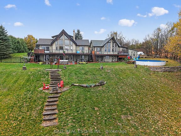 Welcome to 151 Peller Court, located in the luxury Rolling Hills Estates community just a few minutes south of Bobcaygeon on Pigeon Lake that is part of the Trent Severn Waterway. The custom-built home is perfectly situated on 4.8 acres surrounded by tall mature trees giving you all the privacy you will need. Experience some of the most beautiful breath-taking sunrises over the lake. The home boasts 3,242 sq. ft. of living area on three levels and an additional separate in-law suite with 359 sq ft. Featuring an open concept living with a stunning chef's kitchen, high-end appliances, large central island, abundant wood cabinetry and walk out to an expansive deck that is great for entertaining. The kitchen opens to the dining/living room with a stone fireplace, cathedral ceilings, hardwood flooring and floor-to-ceiling windows for an incredible view of the lake. The home entertains a primary suite with it own balcony for sunsets with an evening glass of wine, 2 more bedrooms for family or guests, 3 bathrooms, 2 large rec rooms with multiple walk outs in lower level, stone fireplace and bar. An additional lower outdoor patio provides lovely views of the lake and extra room for guests. An oversized detached triple car garage with a paved driveway, a 4th bay for a work shop and multiple out buildings completes everything. Section of property fenced for security of children and pets playing. This property includes a 1/17th ownership in the Rolling Hills Estates Association, including the boat launch, docking facilities, gazebo and the narrow strip of waterfront along the development. Peller Court is a municipally serviced road.