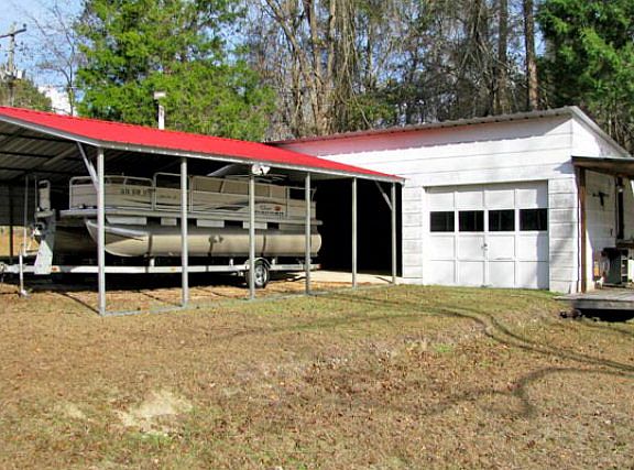 Ranch home located on 4 lots (almost 2 acres) features a Kitchen with tile countertops, electric appliances (including washer and dryer), and laminate flooring. Entertain on the 14' x 20' deck with private wooded views or stroll down the gentle-sloping lot towards the woods bordering the back yard. System features include a 2007 metal roof and a 2014 HVAC unit. Other amenities include a large boat shelter, a workshop, and a covered fish-cleaning area. (Community Covenants and Restrictions apply; please call for details).