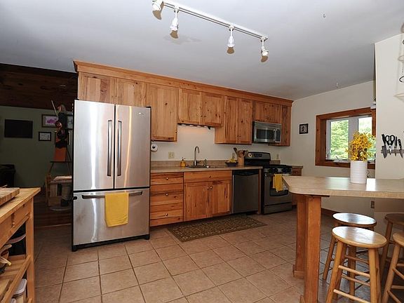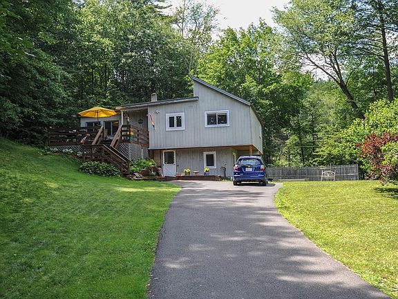 Move right in to this beautifully updated contemporary home! Three bedrooms and two baths with a flexible floor plan, featuring cherry, teak & tile flooring, cathedral ceilings and custom built-ins. Sweet kitchen with black oak cabinetry, breakfast bar and stainless appliances. Nestled on a hilltop with a spacious front deck and scenic view of Mt Toby. Small stream, Goshen stone steps, garden area and 2 storage sheds. Finally You're Home!
