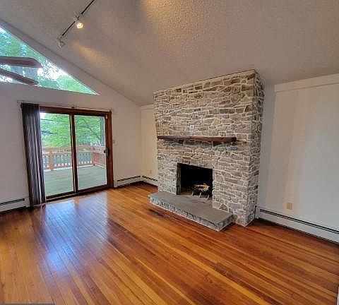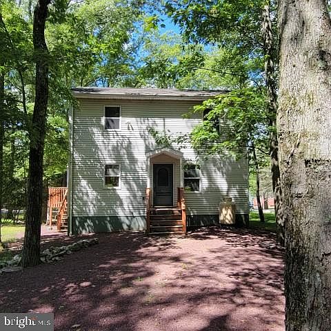 Lake View Raised Ranch with a 2 story addition in Lake Harmony. This home has a tile entryway, family room with free standing propane fireplace, kitchen with tile floors and backsplash, living room with hardwood floors, cathedral ceiling, stone to floor wood burning fireplace, and 3 sliders to the outside deck. Master bedroom has attached bath and a walk-in shower. Home has an unfinished basement with a workshop and a stone fireplace and a full bathroom. Home has oil heat and some window A/C units and is on public sewer. Outside has a large front deck covered patio with a view of the lake and beach. Stone driveway with easement for plenty of parking space.