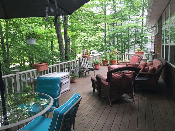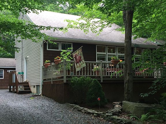 Contemporary home nestled in the woods in the gated, amenity-filled community of Arrowhead Lakes. This 3 bedroom, 2 bath home is in a secluded area where you can enjoy nature from each window. Living room has a wall of windows, cathedral ceiling, and a propane fireplace surrounded by tile. Kitchen area has a full size laundry closet and tile flooring. This level also has one bedroom and a bathroom with tile floors. Walk out to the heated 4 season room from sliders from the living room. 4 season room has skylights! Upstairs has 2 bedrooms and second bathroom. Home has vinyl and cedar wood siding, a heated storage shed outside, a large front deck for entertaining, and a fire pit for cool summer nights. Hot tub is near fire pit! Walking distance to Choctaw pool! Arrowhead Lake is a gated community with security, 3 heated pools, 2 lakes for fishing/swimming and boating, tennis courts, clubhouse, new lodge, fitness center and much more. Activities included just to mention a few are bonfires, carnival, zumba, water aerobics, swim team, potluck dinners, all you can eat breakfasts and summer camp.