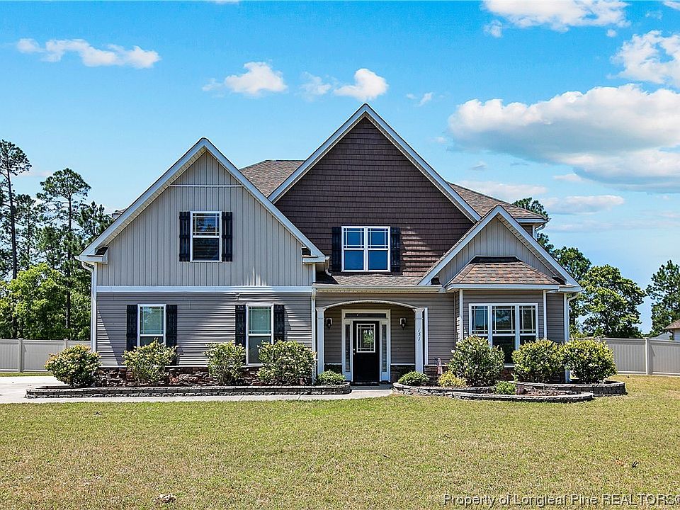 Welcome to the Lakeside Manor community of Carolina Lakes. Gated/guarded community featuring fitness trail, community pool, beach/marina, clubhouse, tennis, basketball & pickle ball court, disc golf, baseball field, park and so much more. This home will not disappoint with its 5 bedrooms, 3.5 bath (primary bedroom with sitting area on 1st floor), living room, family room with a wood burning fireplace, Dining room, open kitchen, and vaulted ceilings. Laundry room 1st floor. The other 4 bedrooms upstairs. This home also features a Vinyl privacy fence, extended driveway and patio. New Roof 2023, hot water heater 2022. Come make this beautiful house your home!