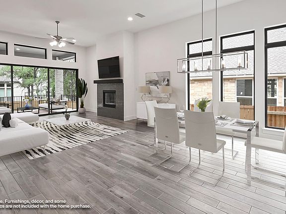 Home office with French doors set entry. Media room with French doors off extended entry. Formal dining room flows into open family room with a wood mantel fireplace and sliding glass door. Kitchen features corner walk-in pantry, 5-burner gas cooktop and generous island with built-in seating space. Adjoining morning area features a coffee bar and wall of windows. Primary suite includes double-door entry to primary bath with dual vanities, freestanding tub, separate glass-shower and two walk-in closets. Guest suite offers private bath. High ceilings and abundant closet space add to this spacious four-bedroom design. Extended covered backyard patio. Mud room off three-car garage. Representative Images. Features and specifications may vary by community.