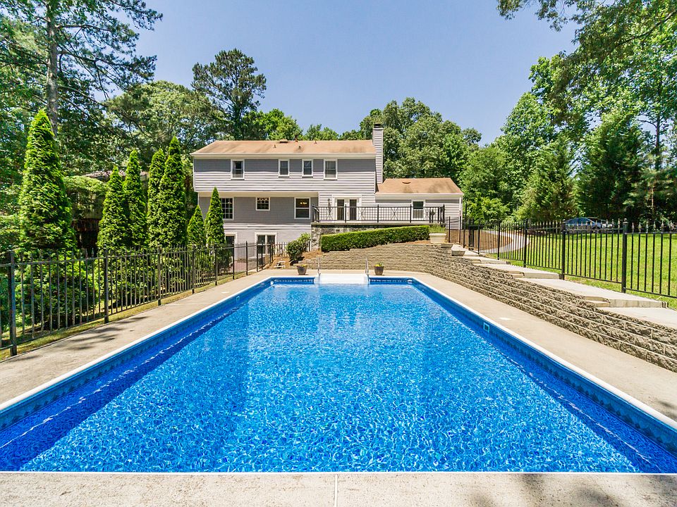 Great E Cobb LOCATION, privacy, maintained home & sparkling pool! 1.3 ACRES in FOX HILLS SUBDIVISION! Light filled rooms, fresh paint, large bedrooms, hardwood floors, NEW carpet, kitchen open to family room. Garage converted to in law suite, w/ full bath to help w/ parents/guests plus great storage. Daylight basement, open space, room available as office/teen hideaway & room for additional storage. Backyard is perfect oasis of peace, sparkling pool & beautiful landscape. <1 mi to Sope Creek ES, close to I-75, I-285, GA400, & many of GA's Ntl Parks & Rec areas!