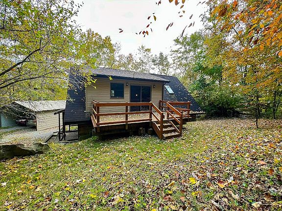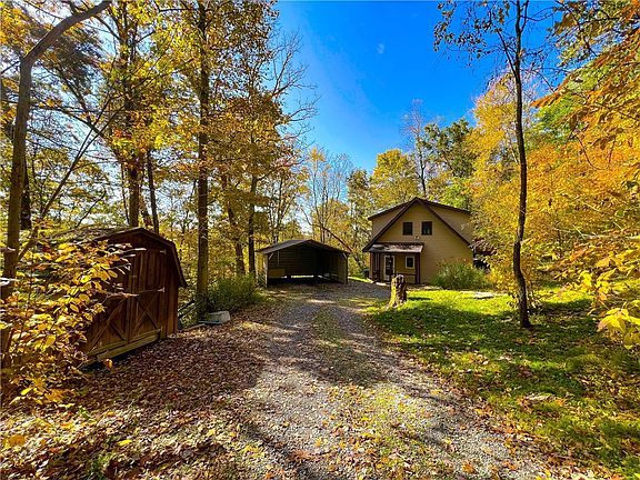 Don't miss this charming cottage nestled in over 4 wooded acres! Enjoy the beautiful nature views out every window. As you enter the home you will find a first floor bedroom, full bathroom, and open kitchen and dining area. The kitchen has updated cabinets and appliances and beautiful skylights. You will love the pine ceilings and wood features throughout. Cozy up by the fireplace. Upstairs you will find a 23x19 living room loft with sliding glass doors to the deck. Outside there is a two car carport, storage shed, and nature rock firepit. Low property taxes and endless opportunities with this property!