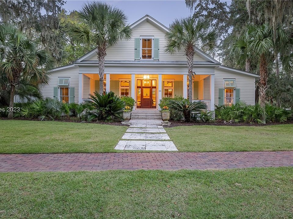 Nestled on a tranquil half-acre corner site, this single level home is located just across from the picturesque May River in South Wilson. Designed for entertaining, the main house centers around a great room with dramatic beamed ceilings and double sided fireplace, flowing seamlessly out to a screened porch with a fireplace and gas grill. The kitchen, with induction stove and warming drawer, is adjacent to a large wet bar with ice maker. Walnut floors and brass hardware evoke a British West Indies feel. 4th bedroom suite over the garage is ideal for guest space or a home office, with a balcony overlooking the spacious yard towards the river.