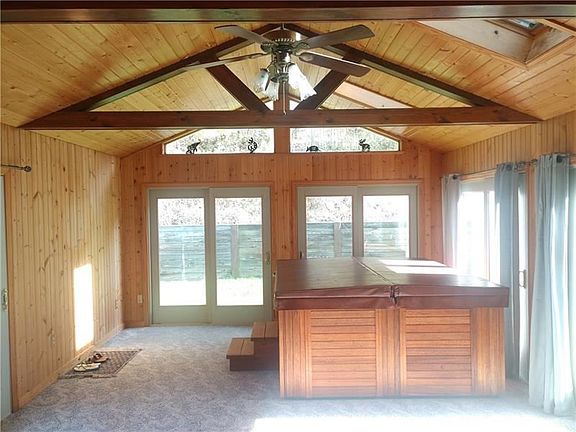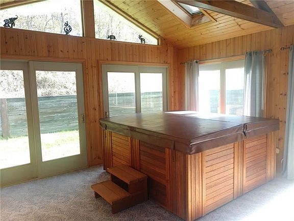 This three-bedroom split entry sits on .40 acres in the Blackhawk School District and features a 20' X 20' addition built just for relaxation with a hot tub spa, five sliding patio doors, two skylights, wooden beams, knotty pine walls, and a freestanding vent-free natural gas stove. A deck is accessible through one of the patio doors. The bathrooms were updated in 2012 and new windows were installed in 2019. You will appreciate all the newer solid wood interior doors. A 22' X 12' finished family room on the lower level includes a bar with stools and a back bar. All appliances are included in the sale as well as the shed. Gutter Guards are installed. This house is conveniently located just minutes from I-376 and Route 51.