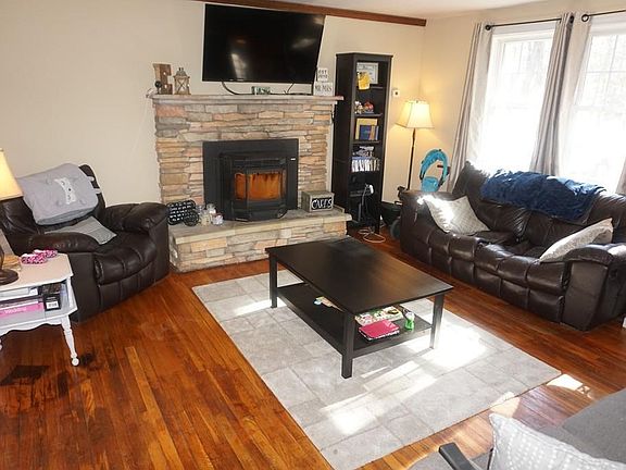 Move in ready three bedroom ranch, come enjoy the ease of one level living! This home features: three bed rooms all with hardwood flooring, large living room with hardwood flooring and a fireplace with a pellet stove insert, and a good sized eat-in kitchen. The basement is a good size and was finished before, the framing is still there if you would like to use it to finish it in the future. The furnace which has on-demand hot water was just replaced less than two years ago. There is also a one car attached garage and several off street parking spaces available. This home is situated on a large lot over two acres and it is wooded. Also has a large fenced in back yard. Home is subject to the seller finding suitable housing.