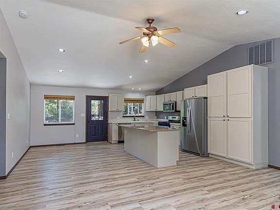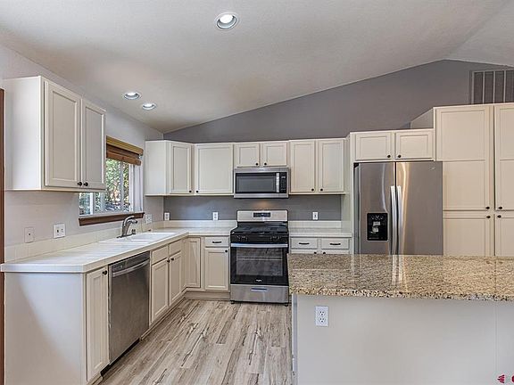 Welcome to this inviting single-level gem in Durango West 1. This lovely cedar-sided home sits on a quiet street adjacent to open space, ensuring peace and privacy. As you step inside, you'll be greeted by a bright and spacious living room featuring tall vaulted ceilings and updated vinyl plank flooring. This large living room flows seamlessly into the kitchen and dining area which makes a perfect setup for gatherings and entertaining. The kitchen is a highlight with its granite countertop island, updated appliances, and freshly painted cabinets offering plenty of storage. Step outside to the delightful fenced backyard which includes a cozy flagstone patio and spacious side areas, perfect for creating your own outdoor retreat or play area amidst the peaceful natural surroundings. Inside, the well-designed floorplan of the home places two bedrooms and a full bathroom on one side of the home, while the primary suite is on the opposite side of the home. The primary suite features its own full bathroom and a spacious walk-in closet along with a large window allowing for a nice amount of natural light. Additional features of the home include a large oversized one-car garage with shelving, ample off-street parking, and room for storing a boat or RV. Located on one of the neighborhood's most desirable streets, this home offers comfort, convenience, and a welcoming atmosphere—a perfect place to call home.