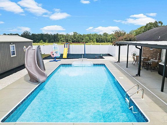Atmore, AL - Robinsonville Area - Modern Home with Exceptional Updates & Features! Built in 2015, this modern home offers 3 bedrooms & 2 beautifully updated bathrooms within its 2,351 sq.ft. floorplan. Step inside the bright & airy living room features a corner gas log fireplace. The kitchen, with its recent upgrades, seamlessly connects to the dining area. The open concept between these spaces makes family meals & entertaining a breeze, while the split floor plan ensures privacy with sizeable bedrooms for comfort. The primary bedroom includes a calming ensuite bathroom with a double vanity, walk-in shower featuring dual shower heads & a rain showerhead, a garden tub & his-her walk-in closets. A large laundry room serves as the perfect drop zone between inside & the double carport. From 2022-23 the home was refreshed with: new granite countertops in the kitchen and both bathrooms; farm sink, modern faucet & refaced cabinets in the kitchen; shiplap walls, new light fixtures & vessel sinks in both bathrooms; new recessed lighting has been added in the living room, utility room, guest bath & kitchen; vinyl plank waterproof flooring throughout the main living spaces & 2 bedrooms; and new carpet in the 3rd bedroom. Situated on a 2.2-acre lot, this property provides a perfect blend of indoor luxury & outdoor enjoyment. The covered patio is equipped with ceiling fans & 800-gal American Spa hot tub that overlooks the 16x32 Hayward saltwater inground pool enclosed by a 6ft tall white vinyl privacy fence all installed in 2021. The 12x40 shed with a porch & 16x40 lean-to also hosts a game room, offering a flexible space for a play area, hobby room, or rec room. The 4ft tall black vinyl-coated chain link fence in the front yard is good for keeping pets or children safely enclosed with plenty of room to run & play.