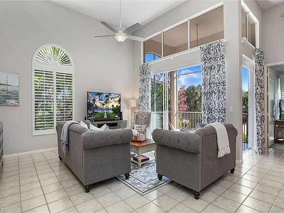 Welcome home to this inviting end-unit, in the treetops of Clermont where comfort meets coastal tranquility. This coach home showcases a bright, open concept with soaring ceilings featuring transom and arched windows to allow abundant natural light into the home to create an airy ambiance. The expansive great room flows seamlessly to a private screened lanai, ideal for morning coffee or evening relaxation, overlooking lush tropical landscaping, a serene lake and a soothing water feature. The eat-in kitchen boasts elegant white cabinetry, stainless appliances, granite countertops, a pantry, updated fixtures and hardware and a breakfast bar adjacent to the dining area ideal for casual dining and entertaining. Retreat to the spacious primary suite with sitting area and picturesque views complemented by a spa-like en-suite bath with custom shower tile and a generous walk-in closet. Enhancing the home’s timeless appeal is a newer HVAC with a smart AC Tech system for easy maintenance and better efficiency along with a transferable warranty on the HVAC and appliances, custom plantation shutters, a fresh paint palette, updated ceiling fans and recessed lighting with dimmers, newer front door and garage door opener. Enjoy resort-style living with a sparkling pool and spa at the Clemont clubhouse, plus a well-appointed Pelican Marsh community center in proximity featuring a fitness center with state-of-the-art equipment, six lighted pickleball courts and eight Har-Tru tennis courts, three lighted regulation bocce courts, library/computer room, banquet/meeting facilities and spa services, all just minutes from Naples pristine beaches and the sophisticated uptown Mercato’s vibrant shopping and dining center.