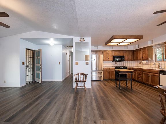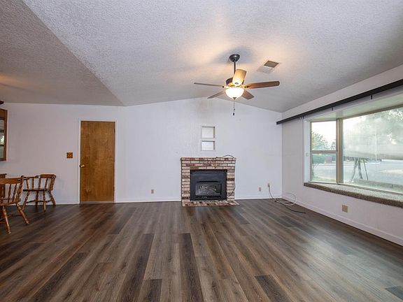 Great open floor plan situated on a large corner lot. 3BR, 2BA with additional enclosed patio space off master bedroom. New flooring in family room with a brick fireplace (gas insert) that is open to the spacious kitchen and eating area. Oversized garage with separate laundry space. Existing R.V. parking, 2 storage sheds, covered patio and a built-in clothes line. Call today for your private. showing!