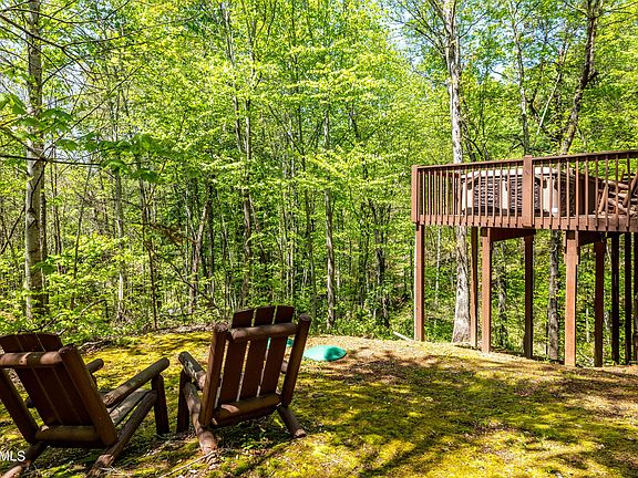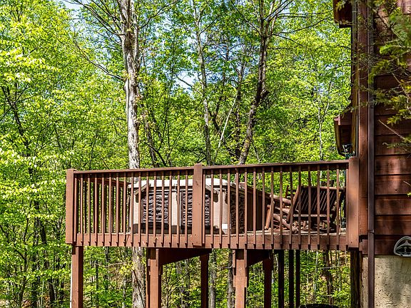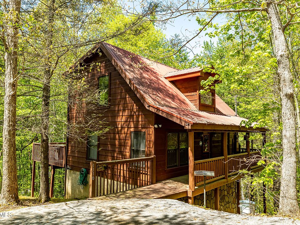 Great opportunity to acquire your own hideaway in the mountains! Right next to Gatlinburg & Pigeon Forge attractions, yet peacefully nestled in the wooded hills of popular Sky Harbor! Must see the rustic charm and warmth of this natural abode with its pine floors, walls, and hand-carved wood railed staircase accessing upper half story loft! Stone fireplace! View woods and nature out your picture windows! Big bedroom on main level featuring an in-room whirlpool tub! Perfect for your second home or excellent rental investment at the most visited national park! This special cabin comes fully furnished, with beds, furniture, TV's and more! Covered front porch with swing, plus nice private deck with fabulous hot tub! Private cul-de-sac, short sloping driveway for that mountain experience!