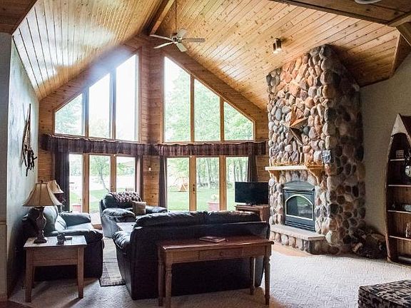The Getaway Chalet on Eagle Lake-3 bed/2 bath chalet on 113' of LEVEL sandy frontage! As you enter the newly updated and refurnished home, you are welcomed by a large, open living space with walls of windows that overlook 572 acre Eagle Lake. Eagle Lake is a full recreation, Class A Musky lake, part of the famous Eagle River chain. As you enter the lake, it is only 2-3 feet deep for the first 10-15 yards so it makes a great place for children to hang out in and play. Sit around the fire pit and roast marshmallows, or lay back in the hammock and enjoy the lakeside breeze. Life doesn't get any better than this! There is a 4 car detached garage, perfect for storing all those up north toys. This home has a great rental history and all furnishings, furniture and appliances are included!