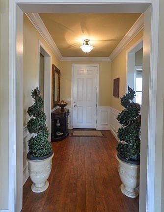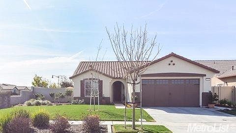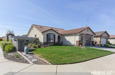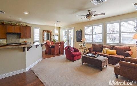 Lots of upgrades! Carpet in great room & bedrooms, wood laminate at entry, kitchen & dining area. Tile in baths & laundry. Kitchen has black appliances, granite counters, stainless farm sink & pantry closet. French doors from dining to rear. Master has walk-in, bay window & crown. Master bath has dual sinks & no-lip shower. Ceiling fans & shutters throughout. Corner lot, rear covered patio & upgraded landscape w/custom lighting & spots. Holiday light outlets & water softener included.