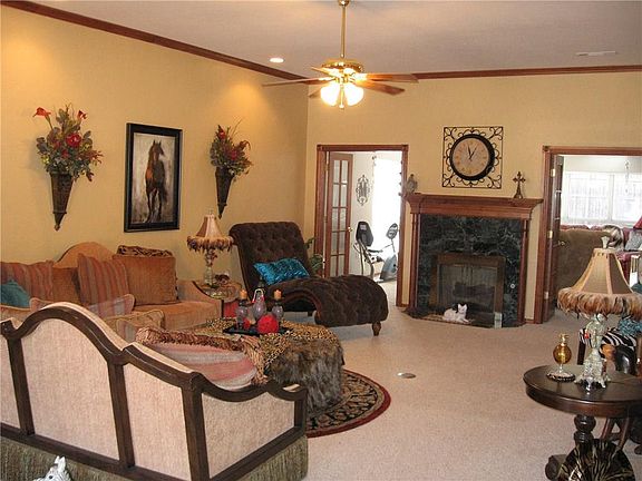 Granite counter tops in kitchen, new sink & faucet, new dishwasher storage building and covered patio, New paint thru out, Kitchen has lots of cabinets and storage, Beautiful wood trim and crown molding, pretty entry door, Formal Dining w/wood floor, + eating space and bar in kitchen, Formal Living and Den, Office, gas logs, security system, sprinkler system, central vacuum, This is a beautiful home and seller might consider trade in good area. Priced at $89 a square foot. Seller will look at all reasonable offers. Seller reserves: Deer and Fountain, Sheer curtains and guest bedroom curtains.