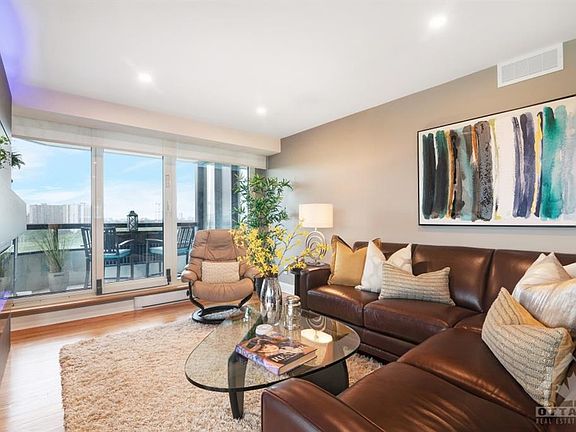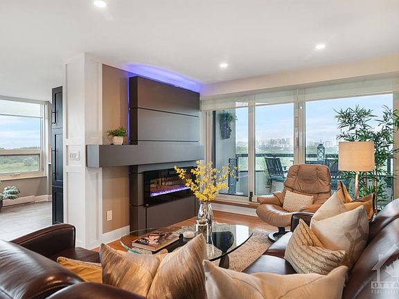 The "Montpellier" in Tower II of The Riviera offers approx 1764 sq.ft. (from Bldr's Plan) with many upgrades & features that MUST be seen. The stunning remodelled kitchen w/top of the line appliances has easy to maintain Quartz countertops+2 bar stools for a quick breakkie or lunch. Beautifully refinished HW floors thruout most of the rooms with an attractive built-in electric fireplace displaying various light & flame colours. Newer & additional electric baseboard heaters with programmable thermostats. Access to a spacious balcony with an unobstructed/panoramic view of the Rideau River, Gatineau Hills & downtown Ottawa! Second bedroom has a secondary access to the balcony as well as an adjacent 3-piece bath. The 3rd bedrm is currently being used as a family rm. This is a one of a kind suite with endless upgrades+2 parking spots & 2 lockers!! Room measurements are approx. See Feature Sheet, List of Upgrades & Floor Plan attachments.