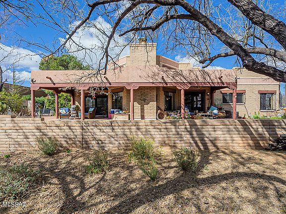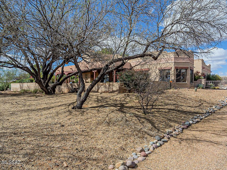 This unique solid slump block home is for those who cherish privacy, open space (1.12 acre lot), and no HOA (that means you can park your RV here!) but want the amenities of GVR! Built in 1989, it has been upgraded with all new saltillo tile floors in 2018 with wood-look ceramic tile in the den. No carpet! The kitchen was recently updated with stainless steel appliances, a convection smooth top range, convection microwave, all new cabinetry with lots of drawers and pull-out shelves, plus pewter tile backsplash, and granite countertops! There are multiple covered patios outside with both privacy and mountain views. Inside, you'll love the huge living/dining room area with 14 ft. ceilings, peeled pole accents, a wood burning heatilator fireplace, and a wood beamed ceiling. There are ceiling