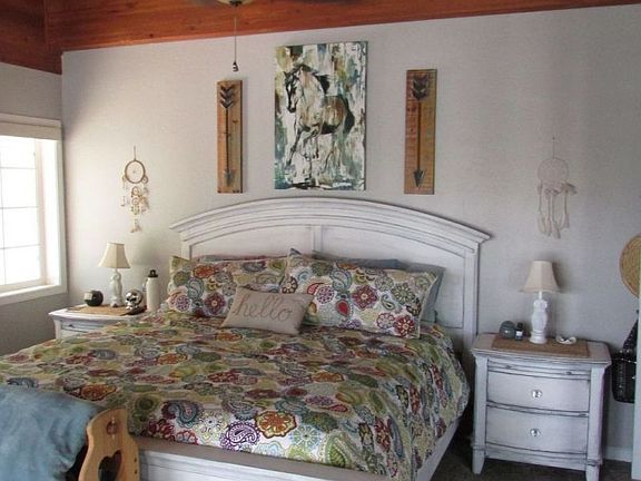 This beautiful move in ready home located near the top of Silicz is looking for a new owner. You need to see the inside of this home to appreciate the beautiful wood ceilings and updated paint and windows. 3 bedroom 1 bath split wing floor plan includes open kitchen with modern black stainless appliances included, family dining room and great room with large windows. Office alcove with room for two work stations. The bath has custom tile throughout and a large tiled shower. Nice size laundry with cabinets.Double French doors in the master open out to a patio with views across the valley. Barb b Que and hot tub area on the side. hot tub is included. Below the patio is a 30 x 40 workshop with overhead lighting a roll up door and 220vac power. Granny flat plus storage building. Two large Carports plus covered parking in front of workshop. Private water company $70 month.