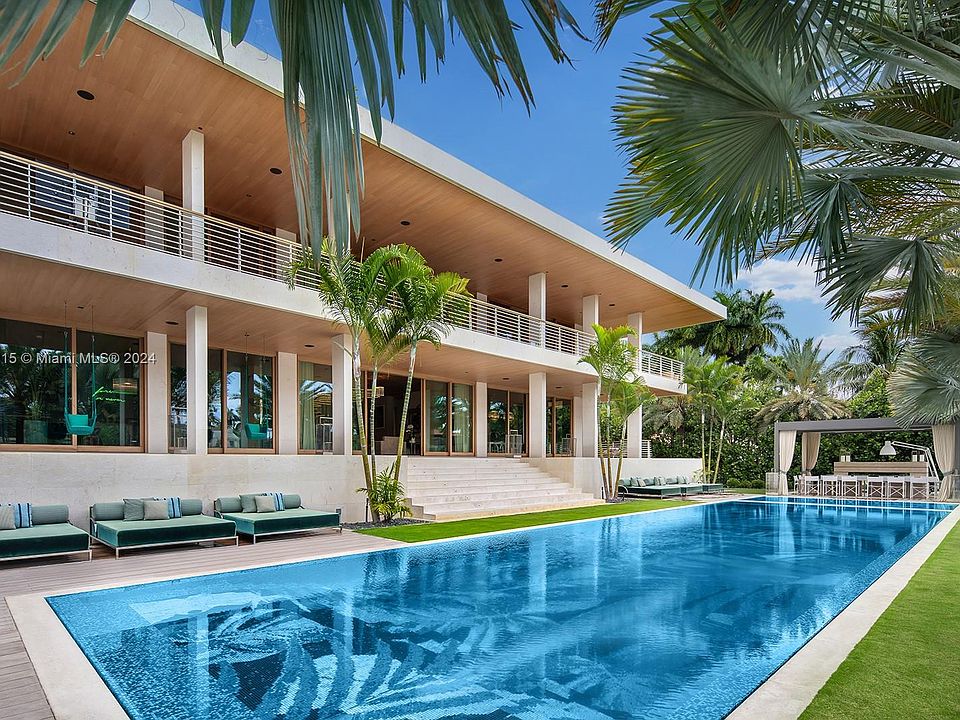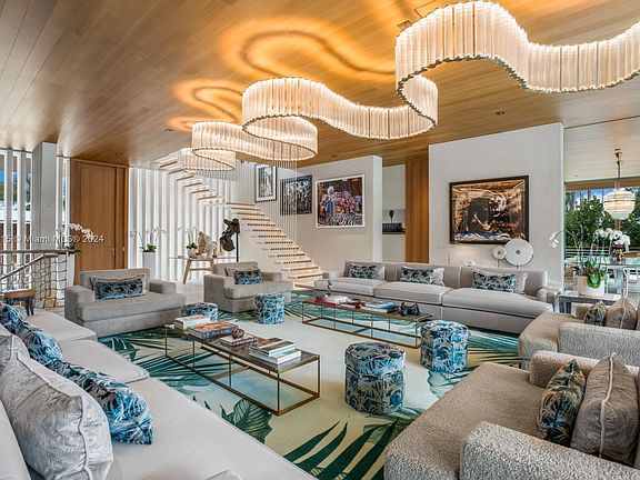 Step Inside With Me! Life.Style on Sunset Islands. This estate exudes swagger and sophistication. Masterfully designed, the use of teak throughout ushers in a new standard in architecturally significant homes. Conceived by Max Strang, its iconic entry pavilion features dual guest suites. Beyond the foyer are the social areas: hosting salon, library, chic sitting lounge, and multiple dining options. The primary suite is both grand & intimate with its fireplace, teak wardrobe, and elegant bath as well as tremendous veranda. The stylistic furnishings are extravagant and comfortable. Complete with a fitness studio, music room, theater, & rooftop, entertainment reigns supreme. Between the glamorous teal pool & 150 ft of water is a curated open-air ambiance equally as stunning as the interiors.