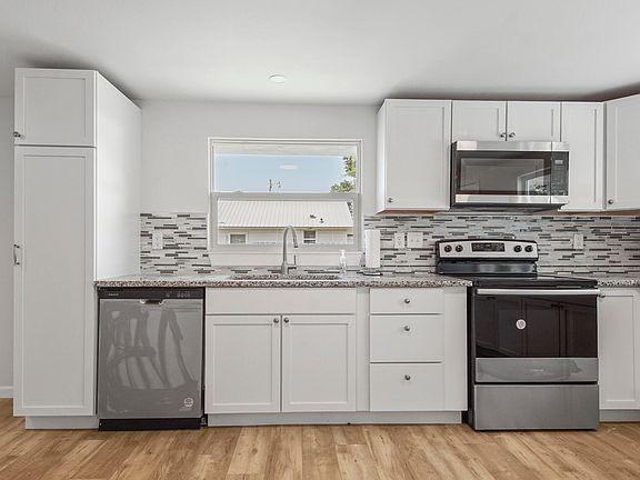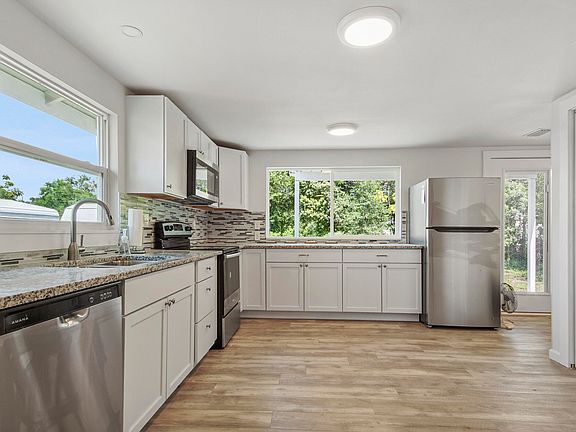 This is an open concept living, kitchen and dining with new vinyl plank flooring, new cabinets with granite counter tops, mosaic backsplash and new stainless steel appliances.