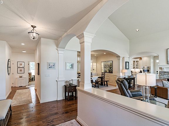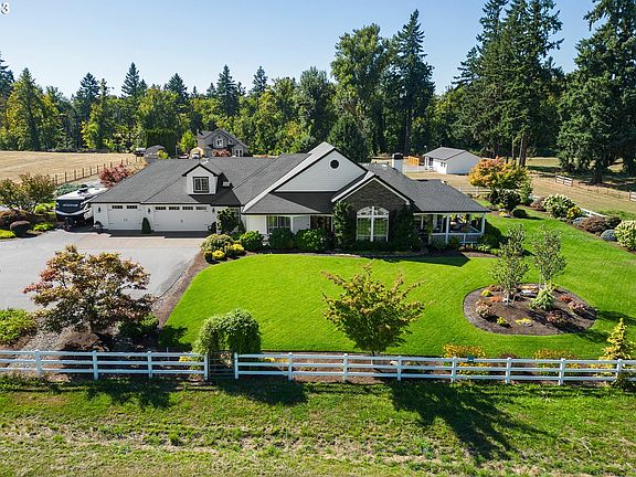 Stunning elegance throughout this custom-built home! Close-in 5 level acres. Light and bright design with large picture windows highlighting rooms throughout. Vaulted living room features hardwood floors, gas fireplace and built ins. Elegant dining room recently updated featuring custom built-in lighted, glass front hutch. Gourmet kitchen highlighted by newer stainless steel Viking appliances: 6 burner gas stove, built-in refrigerator and double ovens. Granite counters, custom cabinets with pull-outs and hardwood floors. Primary bedroom suite features vaulted ceiling, beautiful electric fireplace and walk-in closet. Primary bath includes double vanities, walk-in, dual head shower and free-standing soaking tub with subway tile. Jack-and-Jill bathroom sits between 2nd and 3rd bedrooms. 4th bedroom is currently used as office/den includes built-in desk and cabinets. Large upstairs bonus room great for additional office, game or theater room. Fabulous outdoor entertaining on covered patio or sun patio with water feature. Level property has white vinyl fencing. Creek located in back of treed portion of property. Second garage with workshop and separate 220 service with own meter. All this and more located near I-205, shopping and Clackamas River.