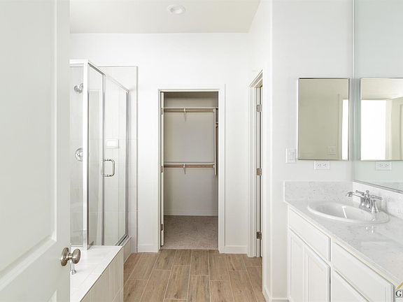 New John Balfanz Home in TUSCANY, 1900 plan, Traditional elevation featuring a split wing design, open living space, 4 bedrooms, 2 baths, white cabinets throughout, Quartz countertops in kitchen,upgraded wood look tile flooring, 2 faux wood blinds, landscaped front yard, covered patio included.