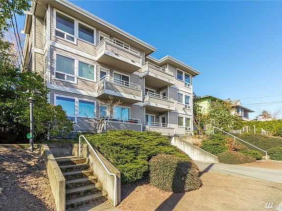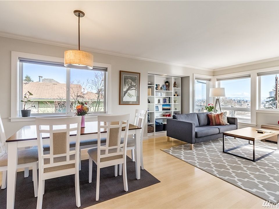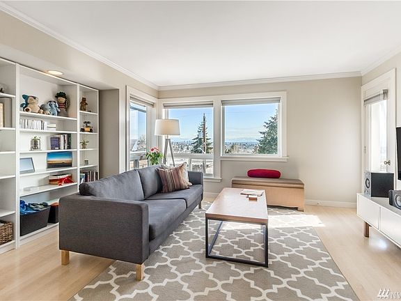 Raise your in-city quality of life standards residing here. This lovely top floor, end unit 2 bed condo on N Beacon Hill has panoramic east city & mountain views to swoon over. Light-filled, open-plan living w/hard-surface floors throughout & view deck. Updated kitchen w/ss appliances, breakfast bar, maple cabinetry, ceramic counters, recessed lighting, ideal work triangle. Master w/view, en suite bath. Formal entry, in-unit laundry, garage parking, secure entry, central location. Must see!