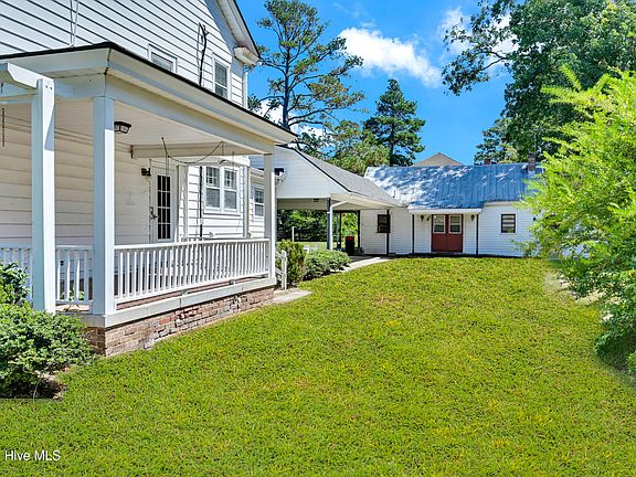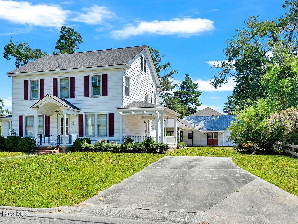This beautiful move-in ready home is a two-store frame Colonial Revival-style house with a three-bay facade, six-over-one sash windows and a flank central door. Architectural features include a side porch, one-story addition with bay window on the north side, a rear one-story wing, and an interior-end chimney. The 4-BR, 3 Bath home features interior details like gorgeous hardwood floors, two fireplaces, an extra large mud/utility room, a dry basement with interior access, a walk-up attic with additional storage and attic fan. The kitchen opens to a breakfast room and then formal dining room. There is a formal living room with front entrance and a large den/family room with fireplace and built-in bookcases. The master bedroom downstairs is separated from the public areas with an attached bath with walk-in shower and so much built-in wardrobe storage. Upstairs, you'll find 3 large bedroom and an office/nursery. A Jack'nJill bathroom connects two bedrooms on the front and back. The hall upstairs has permanent stairs to the attic. The outside is just as impressive with a new roof, large back deck, 3-car attached carport, huge wired workshop and more storage. There is even more storage upstairs over the downstairs workshops. Located in a well-established part of the town's Historic District, it's a great place to walk, visit with friends and neighbors and stroll downtown. Scotland Neck is a golf-cart community with just the main entrances into town not included. This house has been so well-cared for that you just need to bring your suitcase and move right in. Schedule your showing today.