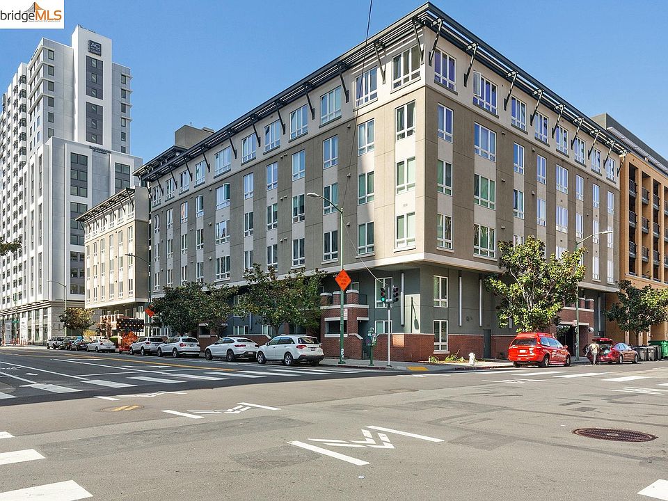Fall in love with this wonderfully airy pied-à-terre in the heart of hip Downtown Oakland! A large picture window anchors the living room, filled with natural light for a warm and sophisticated space reflecting the ultimate relaxed casual California lifestyle. The living room flows easily to the dining area and kitchen and have light maple hardwood floors throughout. Prepare a feast in the modern kitchen with granite counters, ample storage cabinets and SS appliances. Or head out to the wide variety of restaurants, bars, and entertainment venues nearby, from Jack London Square to Uptown, to the Grand Lake District, and beyond. Water activities abound with kayaking on the Jack London estuary or rowing at Lake Merritt nearby. The building has a private courtyard & a glorious rooftop BBQ deck for entertaining. Recover from the day’s activities in your very own oversized bedroom. Double closets lead to a modern bathroom featuring a new mirror and overhead LED lighting. Includes convenient in-unit stack laundry, and 1 parking space in private gated garage with interior access to the building. Easy access to BART, San Francisco, hwys 880, 580, Jack London Sq, & Lake Merritt. Low HOA dues $330/mo w/a healthy reserve. Walk score 98, bike score 93!