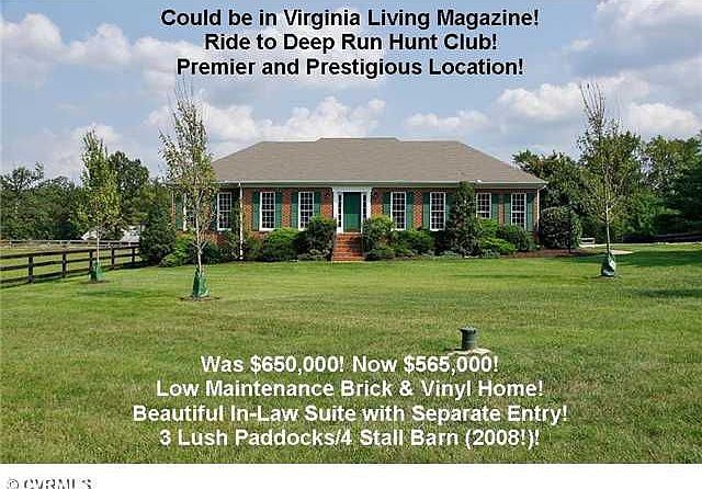Perfect small horse farm on 4+ acres in the heart of Deep Run Hunt Country! Keep your horses in your back yard in a well built 2-3 stall barn with tack room and wash stall, 3 large pastures and a short walk to Deep Run and great trails. The house is a beautifully built 4 bedroom/3.5 bath home which includes a newly built attached inlaw suite. Main house consists of 3 bd/2.5 baths, large eat in kitchen with new granite counters and new stainless appliances, hardwood floors in most rooms, a beautiful master suite with deluxe master bath, large walkin California closet, and French doors leading to a deck which overlooks the beautiful rolling pastures. Other features include a beautiful Den/Great Room with hardwood floors and gas fireplace, dining room with crown and chair moulding, a powder room with pedestal sink and wood floors. The inlaw suite features a private entrance, large bedroom, den with hardwood floors, kitchenette with granite counters, elegant private bath with tile floors, shower, and granite counters. No detail has been overlooked in this well built, lovingly updated home. This is a must see and a rare opportunity!