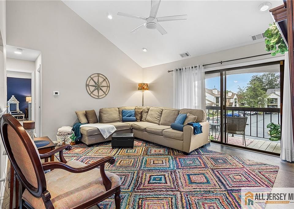 Welcome to this light-filled upper-level end-unit Chesapeake model condo in the desirable Harbour Club community. Offering 2 bedrooms, 2 full bathrooms, and 1,088 square feet of living space, this home combines comfort and convenience. The entry stairs feature newer carpeting and lead to a spacious living and dining room with vaulted ceilings, engineered wood flooring, recessed lighting, a ceiling fan, and access to a private balcony with a storage closet. The updated kitchen has a pass-through to the living room. The carpeted primary suite offers two closets, a ceiling fan, and a full bath with tub/shower combination and Bluetooth light. The second bedroom features engineered wood flooring. A second full bath with new vanity and a laundry closet with washer and dryer replaced in 2024 complete the space. Additional updates include a Lennox AC (2020), replaced electric panel (2019), HOA roof replacement (approx. 2 years ago), and attic with flooring, lighting, and pull-down stairs. The community boasts exceptional amenities, including a clubhouse, outdoor pool, and tennis & pickleball courts, all for a low maintenance fee. Commuters will appreciate the NJ Transit buses to NYC that conveniently pick up within the complex. Located near Rt 9, Rt 35, and the GSP, you'll have easy access to plenty of shopping, dining, and entertainment options.