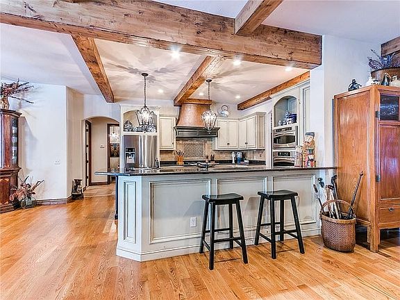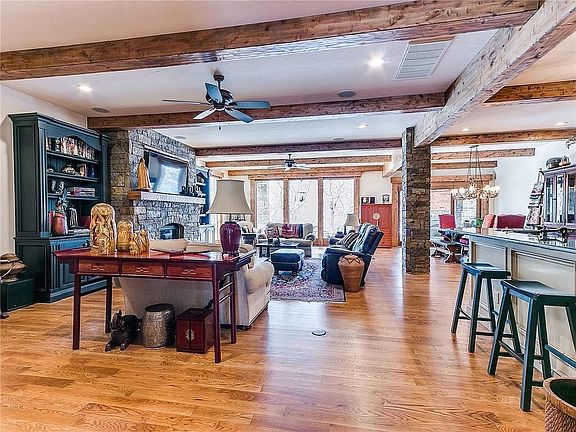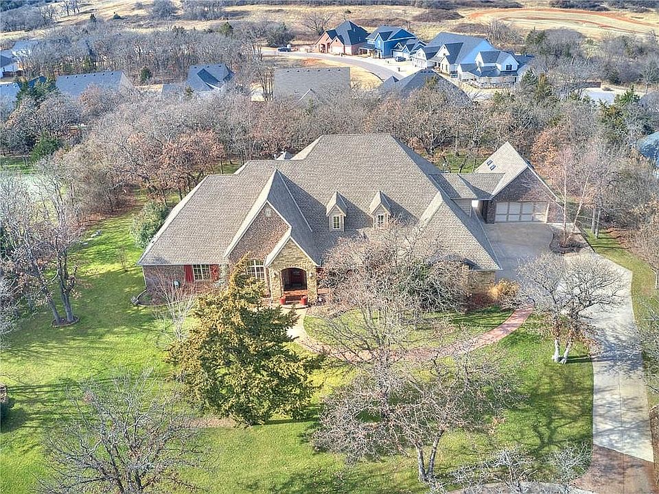 FABULOUS East Edmond home on treed 1+ acre! The casual elegance of this home is ASTONISHING! Open and spacious, floor to ceiling windows, spectacular wood beams, stacked rock accents, huge kitchen island, gorgeous granite countertops, stunning fixtures, loads of storage, and an XL storm shelter. This 5 bedroom home has 4 bedrooms on the lower level - primary suite on one end of the house, 3 bedrooms on the other end. Upstairs is another bedroom, full bath, massive game room with a mini fridge, and a theater room (currently being used as a craft room). Entertaining and family living is a breeze! Nestled on a wooded lot, enjoy the peace and quiet of the private backyard on the covered patio - complete with a fireplace and gas grill! There is a 3 car attached garage AND a 2 car stand alone garage (approx 23' x 24') w/ heat & air - perfect for a shop! Neighborhood has its own park and lake. With EASY access to I35 getting anywhere in the Edmond/OKC metro area is EASY! Don't miss out!