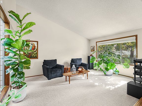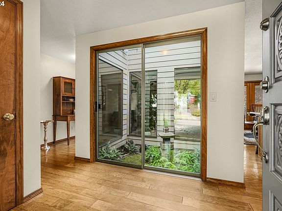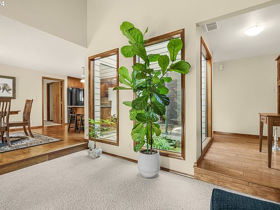 Step into timeless elegance with this beautifully maintained, move-in ready mid-century home, located on a quiet cul-de-sac in the highly sought-after Sunnyridge Estates neighborhood. Once featured in a prestigious Tour of Homes, this architectural masterpiece greets you with a light-filled atrium, showcasing lush greenery that seamlessly connects with the sunken living room's vaulted ceilings, creating a truly unique and inviting ambiance. The thoughtfully designed kitchen offers views of the atrium, complete with a center island, solid surface granite countertops, convenient instant hot water and abundant cupboard space. Adjacent to the kitchen, the dining room, also with an atrium view is perfect for entertaining, with French doors that open to an expansive back deck. A spacious family room shows off a picture window, soaring vaulted ceilings, a cozy gas fireplace, and direct access to the deck for indoor-outdoor living at its best. Retreat to the luxurious primary bedroom, featuring vaulted ceilings, a charming window seat, and an ensuite bath. Two additional well-sized bedrooms and a full bath with a tub/shower complete the main living spaces. For added convenience, the laundry room includes a sink, an adjoining half bath, and access to the garage, making it an ideal mudroom. The large, private fenced backyard is a true sanctuary, featuring a tiered deck with multiple seating areas beneath mature shade trees making it perfect for relaxing or entertaining. Ideally situated in South Salem, this home offers easy access to top-rated restaurants, shopping, schools, Sunnyslope Park just a block away, and three premier golf courses. This home blends mid-century charm with modern comfort and is an absolute must-see!