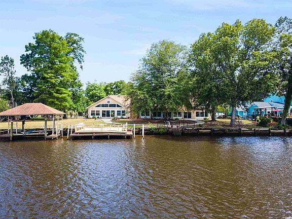 This is the opportunity to own a beautiful home on a double lot with .72 acres and over 180' of Intracoastal Waterway views. There is a bulkhead with a dock with power and water, and a covered 10,000 lb boat lift! The features of this home are exceptionally unique, one of them being the indoor pool with diving board. This pool gets up to 8ft deep, has an overflowing hot tub and has a brand new pool heater. It is in a large room with new windows, skylights, fans, and has a full bathroom, shower, and SAUNA. The pool room opens to a perfect spot for entertaining... the billiards room and large wet bar. There is plenty of seating and it has a fireplace and mantle and a door that leads to the front of the house that could be used as a main entrance. This room leads to the main living area with another fireplace that has a full view of the Intracoastal Waterway! The kitchen has this view as well where you can see the water while you cook. There is a large storage/walk-in pantry and powder room by the kitchen. The owners' suite is on the first floor with 2 walk-in closets and a recently tiled bathroom floor with jacuzzi tub, shower, and double vanity. Upstairs has a catwalk and loft that also can enjoy the view with a split bedroom plan. There is a 2 car garage, plenty of parking in the driveway, mature trees with Spanish moss in the front and back, recently redone sidewalks in the back, all new sliding doors and windows, a new roof in 2019, and so much more. This home is perfect for entertaining and the view of the water is top notch. The location is conveniently located to the Airport, Market Common, dining, shopping, grocery stores and entertainment. Schedule your showing today!