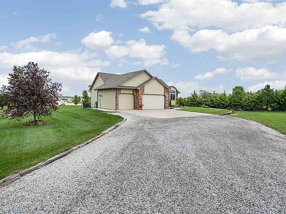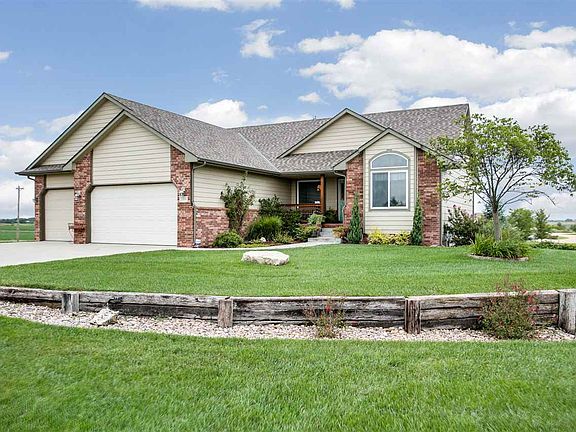 Country paradise only a few miles from New Market Square. Andale schools. 5 bed, 3 bath, 3 car garage ranch style home now for sale!!! You'll enjoy the lovely sunsets and big sky! Rare opportunity to own a gorgeous home on scenic acreage with established trees and NO Specials! This residence has it all and its location is amazing! It is immaculate inside and out!! Seller has spared no expense in updating the home. Open floor plan, vaulted ceilings, open field views. Built in 2008 but updated and feels like new! Breathtaking wood floors flow throughout the entry, living room, kitchen and dining room and one main floor bedroom. Custom inlaid wood accent panels gracefully adorn the living room wall and eating bar - must see! Kitchen is awesome for cooking and entertaining. Granite counters, upper cabinet lighting and upper cabinet decor shelves, stainless steel appliances and walk in pantry. Split master bedroom plan. Master suite includes great views, upgraded carpet, lighting, tall double vanities, new shower door, separate whirlpool tub, crown molding and coffered ceiling. Other features include main floor laundry, 2" wood blinds throughout, tiled bathroom floors, white panel doors, upgraded stylish carpet and super cool custom stained concrete floors in basement that look rustic and resemble cowhide. Excellent attention to detail throughout this home! Whole house sound system with built in speakers plus an additional 7.1 surround sound system in basement family room. Full walkout and view out. Basement is not only beautiful but very functional. Wet bar features full sized sink, full sized fridge, built in microwave, wine racks, lazy Susan, bench seating and so much cabinetry it's like a second kitchen. Family room with large built in cabinet and $5,000 gas fireplace insert with granite surround. Enjoy a fourth and fifth bedroom and a third bathroom plus ample storage. Other features include whole house water filter, water softener, humidifier and reverse osmosis at kitchen sink. New roof 2015. Huge covered concrete patio and covered deck. High efficiency HVAC. The entire acre is on a well and fully covered by the sprinkler system. Hurry this one will not last!