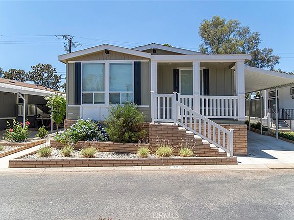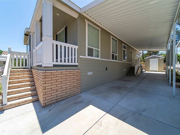 Lake Los Serranos Gem: Active 55+ Living at Its Finest! Nestled in the tranquil Lake Los Serranos community, discover this immaculately maintained 2022 manufactured home, perfect for the active 55+ lifestyle. This home is essentially brand new with 1456 square feet, it features 3 spacious bedrooms and two full size baths. The family room flows naturally into the dinning are and kitchen, making it ideal setting for both relaxed evenings and entertaining family and friends. the well- appointed kitchen boasts white cabinetry with a walk in pantry and ample storage. All essential appliances are included for your convenience. The home's exterior is just captivation, with charming brick accents on the front porch and steps. Also included is a 12x12 shed for extra storage and parking is a breeze with a 2 car covered carport and surrounding parking for guests. The clubhouse is just minutes away, RV storage, and a beautiful pool. The location is prime. Near Orange County and La County. Come and join this vibrant community.