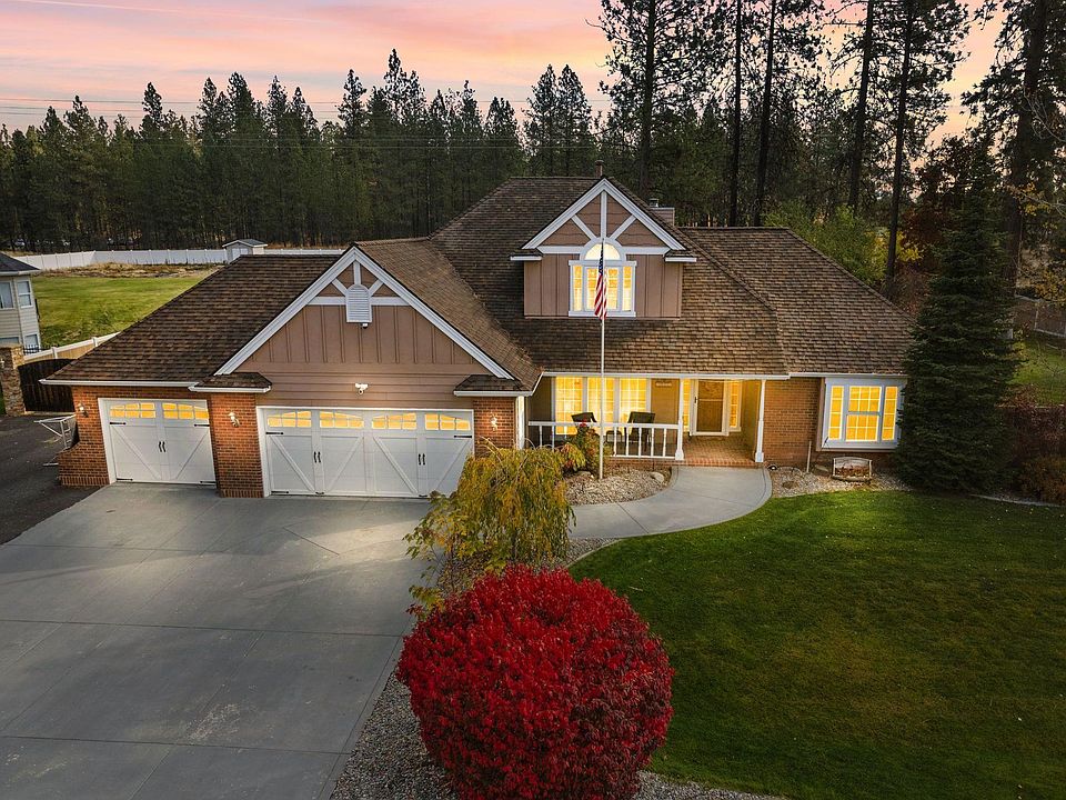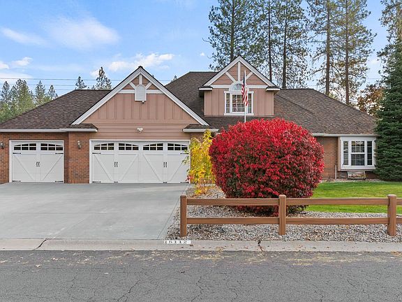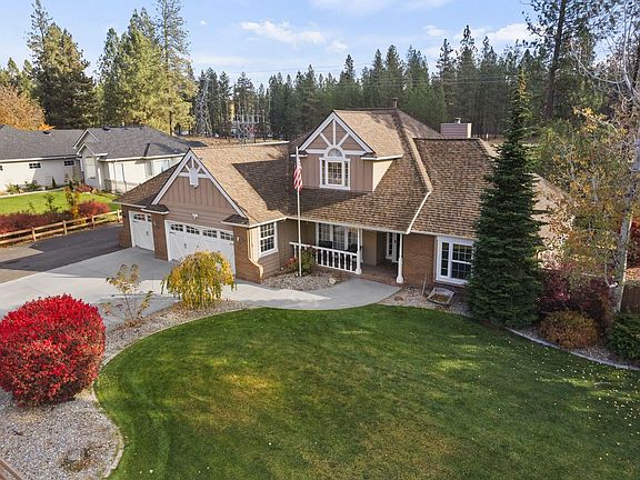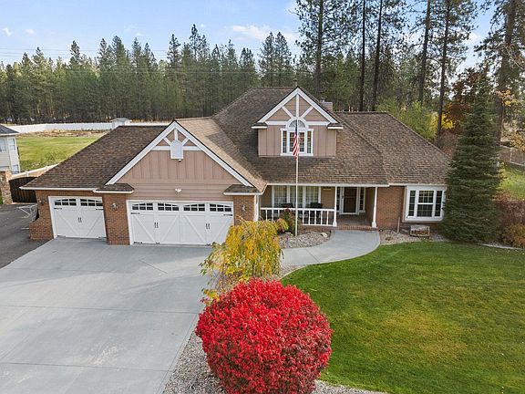 Looking for your storybook home in the Mead School District? Welcome to this stunning 5 bed/4 bath residence in the desirable Pinewood Hills neighborhood! Nestled on an expansive 1.1-acre corner lot, this home offers main-level living with an open-concept design, soaring cathedral ceilings, crown molding, and a cozy gas fireplace. The kitchen boasts granite countertops, stainless steel appliances, and a gas range. The oversized primary suite features a bay window, a luxurious en suite with a jetted tub, and a walk-in closet. Upstairs, two bedrooms share an updated bath. The lower level includes a second fireplace and living room, a built-in office, a bedroom, a full bath, and a multipurpose room. Step outside to your backyard oasis—lush landscaping, a patio, hot tub, fire pit, RV/boat parking, storage shed, and extra lot space beyond the fence. Not to mention a 3-car garage! Just 4 minutes to Yokes in Mead; 8 minutes to Costco; and 25 minutes to downtown Spokane. Watch the video tour today!