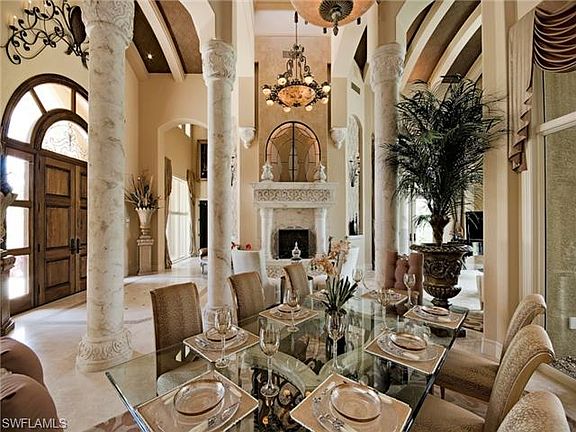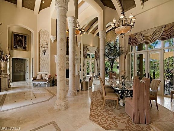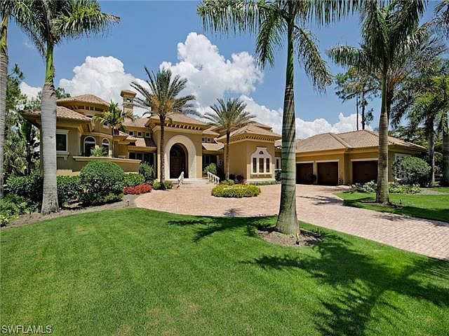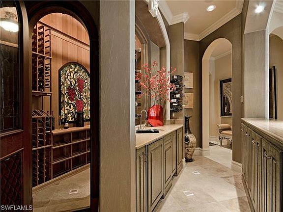 This lavish two story 5 bedroom plus den, 5 full and 2 half bath estate is an absolute showcase of perfection boasting golf course views. Extensive crown moldings highlight the detailed volume ceilings, romantic window treatments, extensive windows, gracious wall coverings, architectural niches, arched passageways, majestic columns and rich marble flooring are only some of the upgraded features found throughout this stunning residence. The masterful interior design boastfully displays an impressive fireplace in the formal living room with an intricately detailed mantle opening up to the Grand Salon with expansive mitered windows to enjoy fantastic outdoor views. The tastefully designed formal dining room along with the adjacent wine cellar and full service wet bar create a seamless flow for formal entertaining. Enjoy outdoor living from the covered loggia featuring an outdoor summer kitchen, a romantic gas fireplace, and two comfortable seating areas. The professionally landscaped lanai is highlighted by a unique reflecting pond with bubbling fountains that cascades over into the sparkling tropical pool creating a spectacular water feature with sweeping views of the 15th fairway.